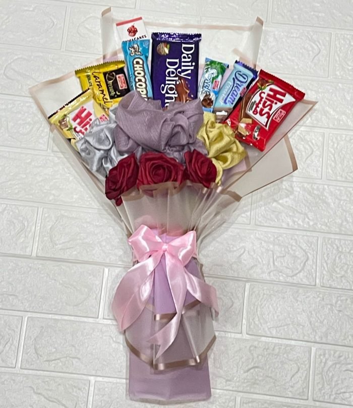 Accompanying the hijab is a handpicked selection of locally made chocolates, featuring popular and loved brands like Hiss and Dream. These chocolates are selected for their rich flavors and smooth textures, offering a delightful treat to complement the elegance of the hijab. Ideal for satisfying any sweet tooth, these chocolates add a touch of luxury and indulgence to the bouquet.