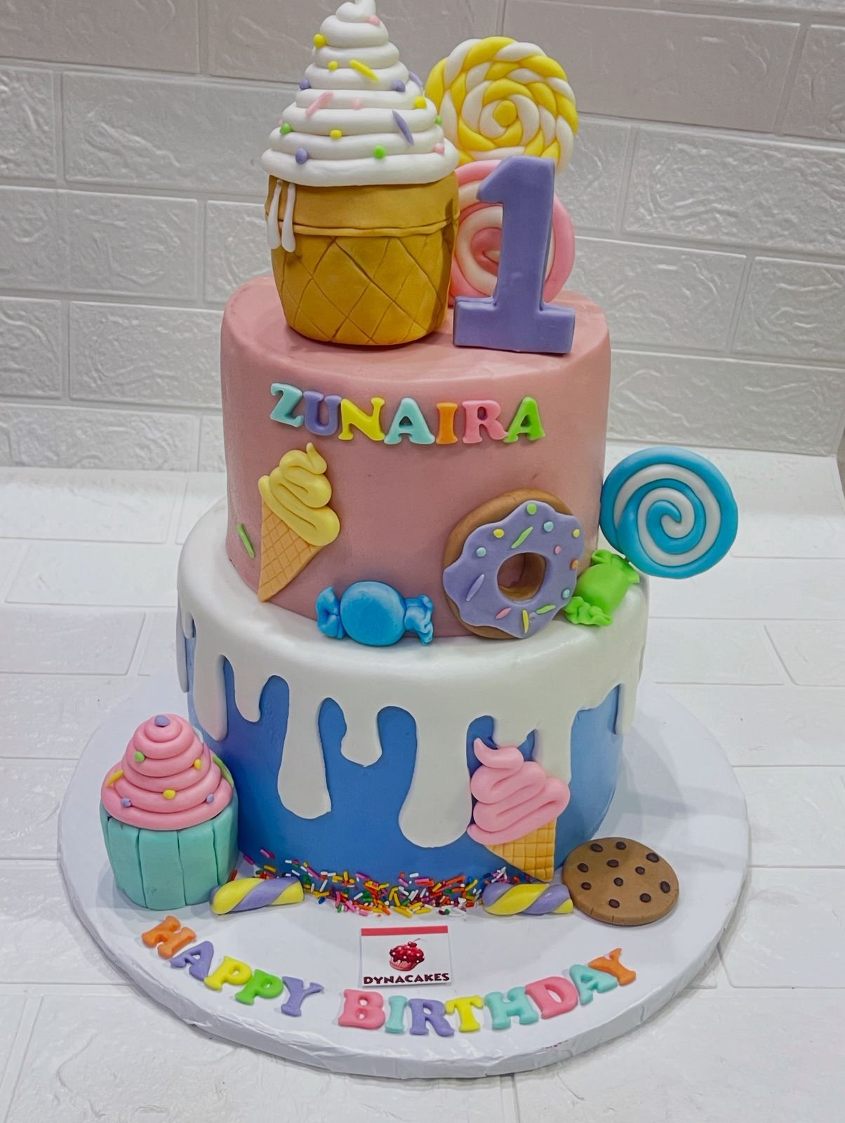 The cake has two tiers, each decorated with sweets children love. The lower tier is cover with blue and white icing that looks like it’s dripping. Around it you’ll notice small fondant designs—cupcakes, candies, a cookie, lollipops, even an ice cream cone. The second tier is light pink with more candy shapes, a donut, and colorful letters for the child’s name. On the very top sits a big ice cream cone with sprinkles and a pastel number “1.” It looks fun and cheerful, like a little candy shop turned into cake.