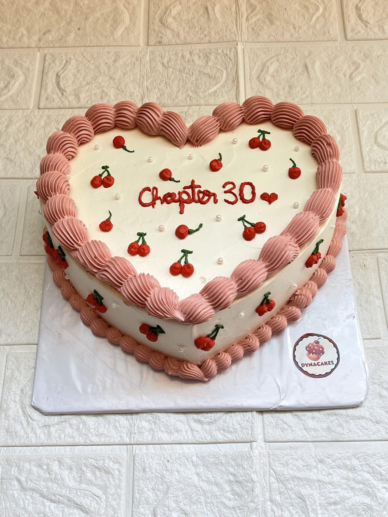 Make your celebration extra special with the Pink Cherry Heart Cake by Dynacakes, a beautifully crafted dessert made to charm at first sight. With its soft pastel tones, cute cherry decorations, and lovely heart shape, this cake is perfect for birthdays, anniversaries, romantic surprises, or milestone celebrations like “Chapter 30.” Its aesthetic style makes it a wonderful choice for anyone who loves cute, minimal, and elegant cake designs.