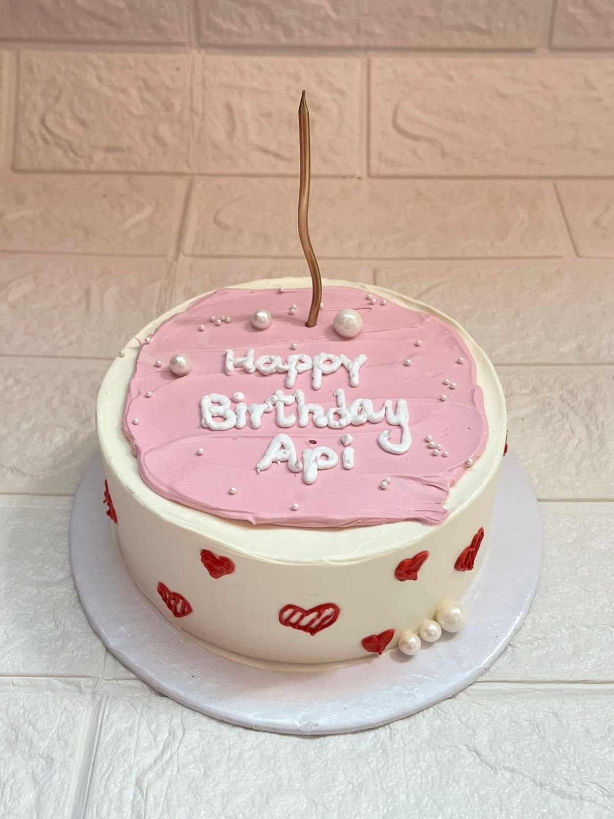 This small happy birthday bento cake for girls has all a girl could ask for. The top is smooth and is in silky pink frosting that resembles a cloud. We wrote “Happy Birthday Api (Sister) or Anything You Want us to Write” in crisp white letters that pop out wonderfully. We’ve added white sweet pearls on top for an elegant look.